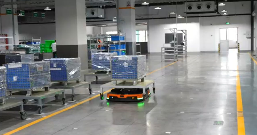 依托 AGV 无人搬运车,将原先由人工承担的原材料转运、成品回收、空箱归集等作业全面自动化。系统不仅可通过显示屏实现全程追踪管理,更借助 AI 智能优化运行路径,高效快捷地完成现场物料配送。同时,通过二维码识别技术,系统可灵活适配新增路线与产线布局调整,具备高度柔性适配能力。