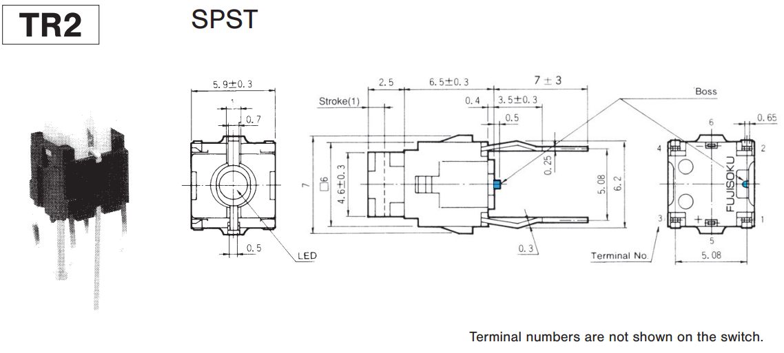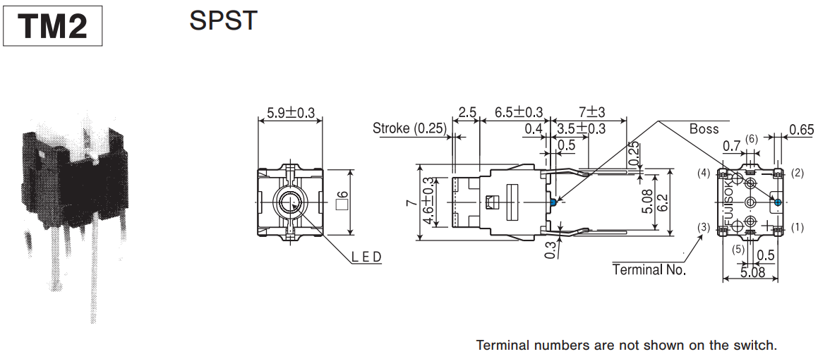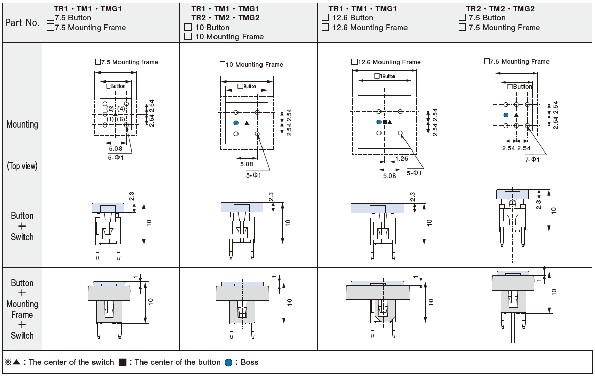 紧凑的外形中、带LED的超小型开关 改进端子结构,防止因焊接热导致的触点接触不良 同一极点上配置了两根端子,使端子具备跳线功能 提供丰富的彩色按钮、安装框架、LED照明等附属部件 所有型号的端子间距均以英寸为单位 符合RoHS规范