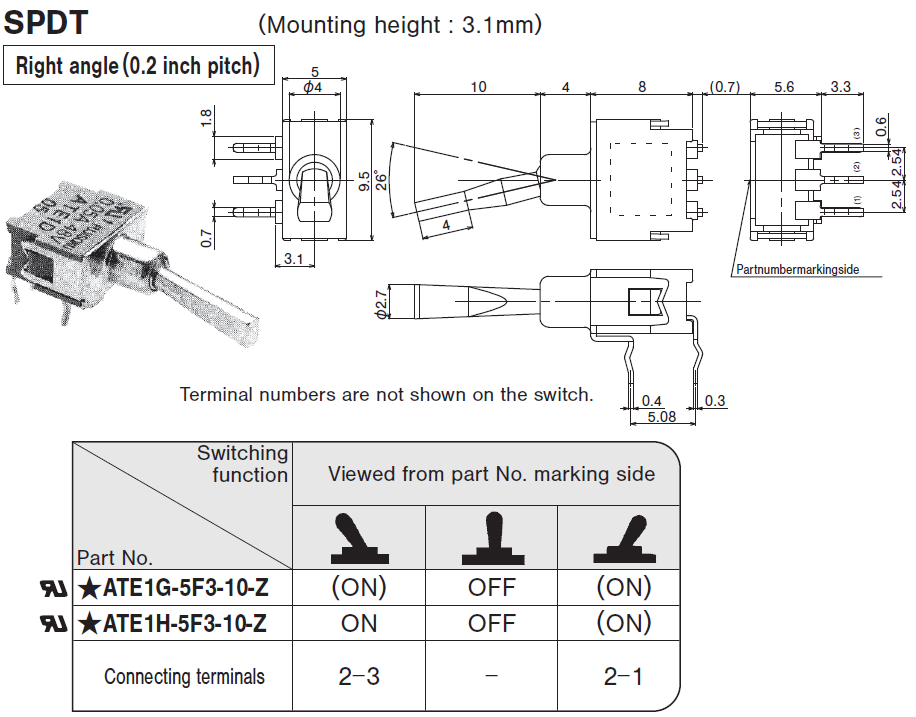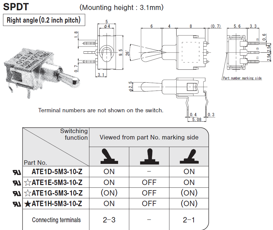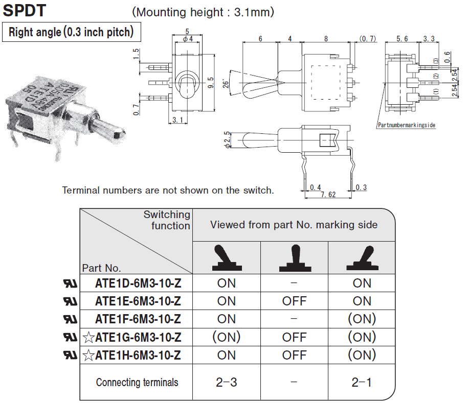 ★ATE1G-5F3-10-Z SPDT Flat toggle 0.2R/A Mounting height : 3.1mm (ON)-OFF-(ON)