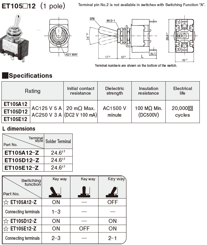 | ☆ET105A12-Z | 焊接端子 | 125V 5A/AC250V 3A | 20mΩ Max.(DC2V 100mA) | AC1500V 1 minute | 100Ω Min.(DC500V) | 20,000 cycles |