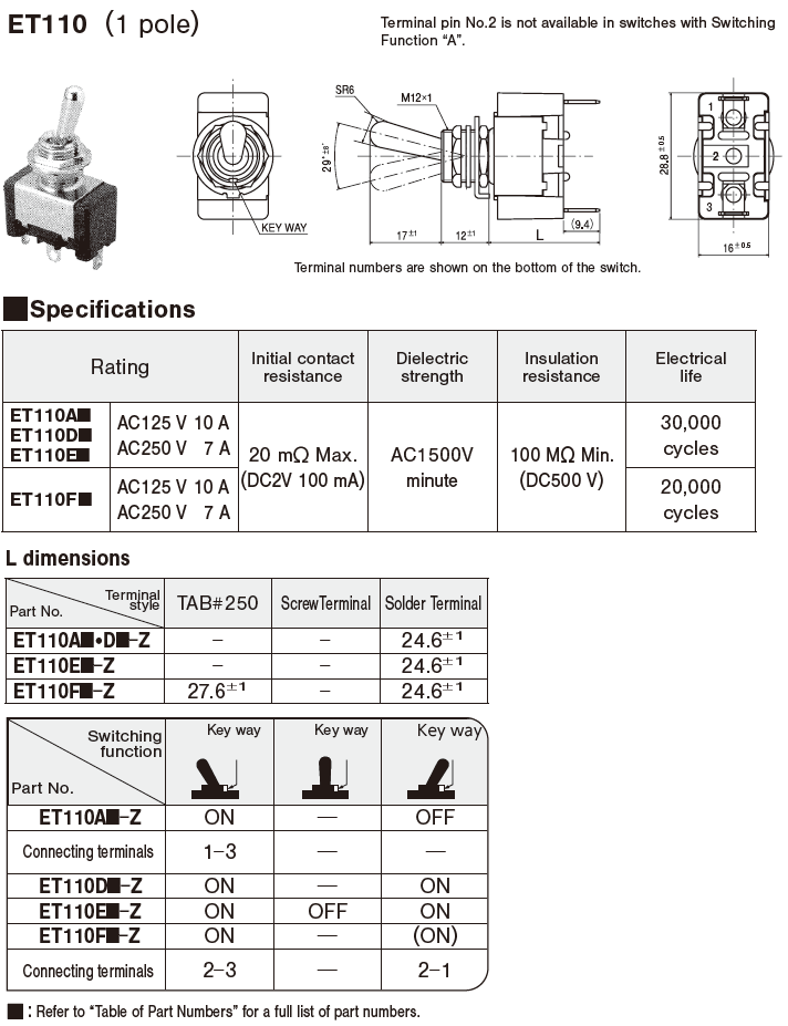 | ☆ET110A12-Z | 焊接端子 | 125V 10A/AC250V 7A | 20mΩ Max.(DC2V 100mA) | AC1500V 1 minute | 100Ω Min.(DC500V) | 30,000 cycles |