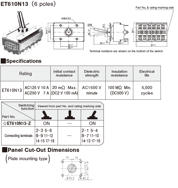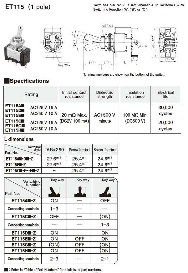| ☆ET115A10-Z | Screw Terminal | 125V 15A/AC250V 10A | 20mΩ Max.(DC2V 100mA) | AC1500V 1 minute | 100MΩ Min.(DC500V) | 30,000 cycles |