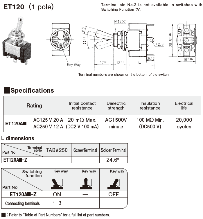 | ★ET120A12-Z | 焊接端子 | 125V 20A/AC250V 12A | 20mΩ Max.(DC2V 100mA) | AC1500V 1 minute | 100Ω Min.(DC500V) | 20,000 cycles |