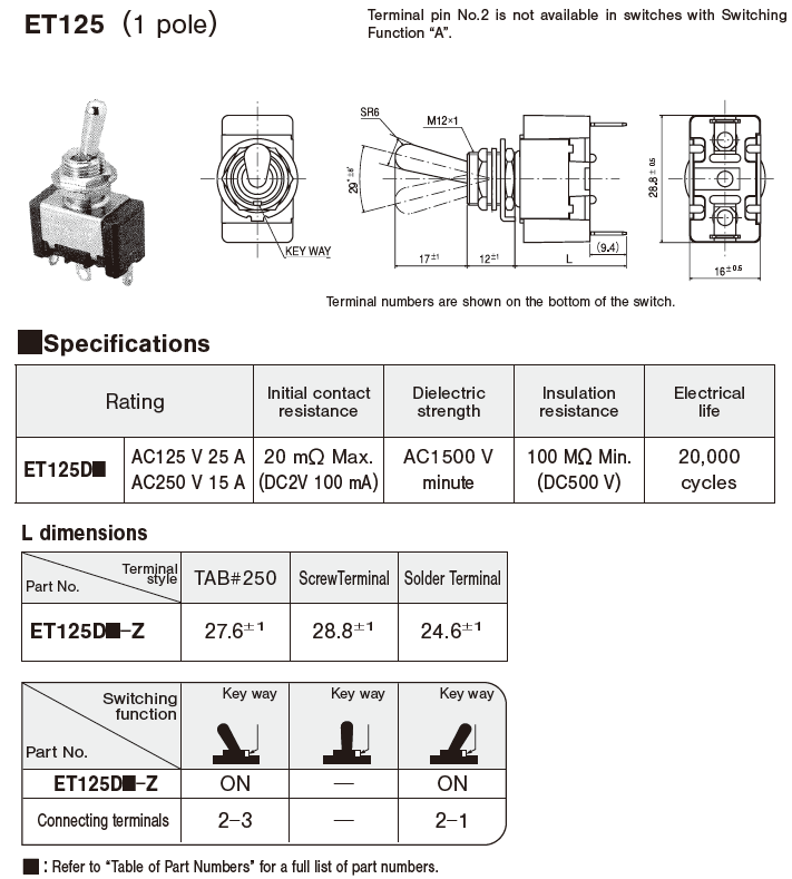 | ★ET125D12-Z | 焊接端子 | 125V 25A/AC250V 15A | 20mΩ Max.(DC2V 100mA) | AC1500V 1 minute | 100MΩ Min.(DC500V) | 20,000 cycles |