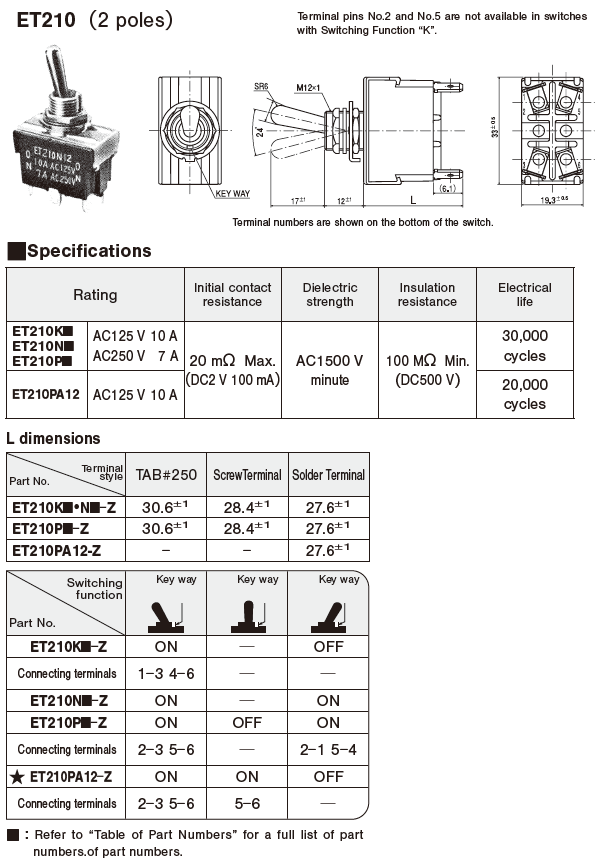 | ☆ET210K12-Z | 焊接端子 | 125V 10A/AC250V 7A | 20mΩ Max.(DC2V 100mA) | AC1500V 1 minute | 100Ω Min.(DC500V) | 30,000 cycles |