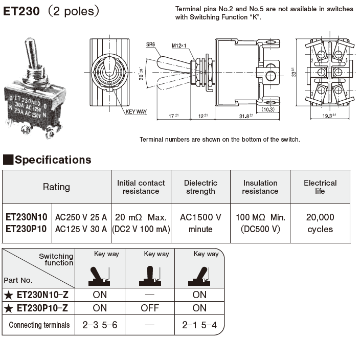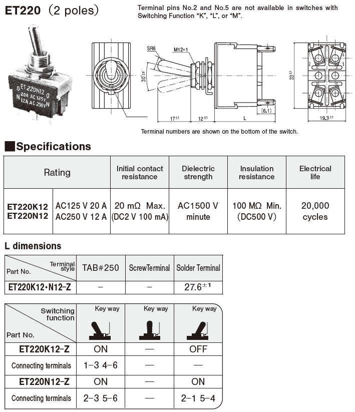 | ★ET220K12-Z | 焊接端子 | 125V 20A/AC250V 12A | 20mΩ Max.(DC2V 100mA) | AC1500V 1 minute | 100Ω Min.(DC500V) | 20,000 cycles |