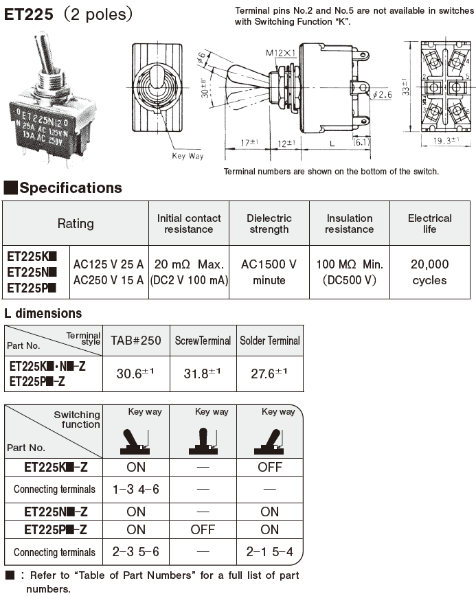 | ☆ET225K12-Z | 焊接端子 | 125V 25A/AC250V 15A | 20mΩ Max.(DC2V 100mA) | AC1500V 1 minute | 100Ω Min.(DC500V) | 20,000 cycles |