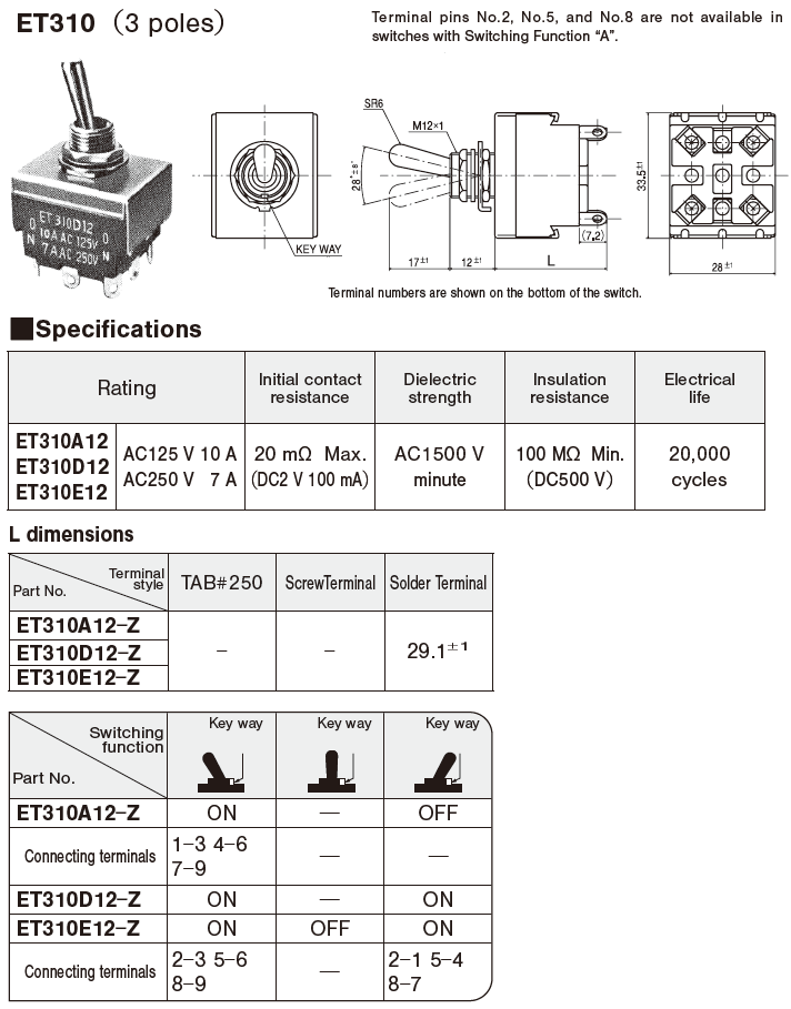 | ☆ET310E12-Z | 焊接端子 | 125V 10A AC250V 7A | 20mΩ Max.(DC2V 100mA) | AC1500V 1 minute | 100Ω Min.(DC500V) | 20,000 cycles |