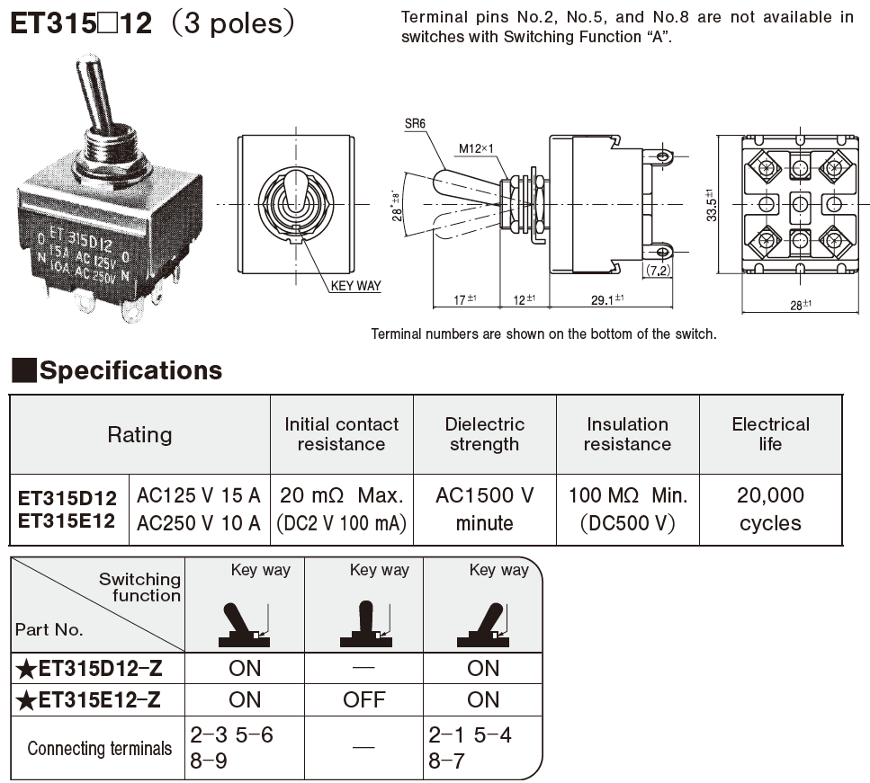 | ★ET315D12-Z | 焊接端子 | 125V 15A/AC250V 10A | 20mΩ Max.(DC2V 100mA) | AC1500V 1 minute | 100Ω Min.(DC500V) | 20,000 cycles |