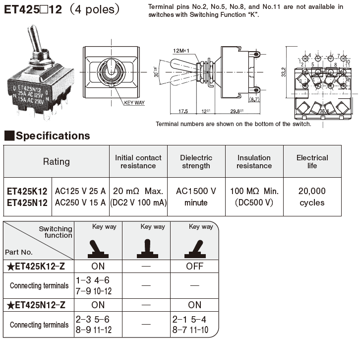 | ★ET425K12-Z | 焊接端子 | AC125V 25A/AC250V 15A | 20mΩ Max.(DC2V 100mA) | AC1500V 1 minute | 100Ω Min.(DC500V) | 20,000 cycles |