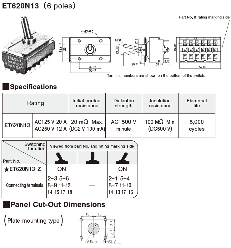 | ★ET620N13-Z | 焊接端子 | 125V 20A/AC250V 12A | 20mΩ Max.(DC2V 100mA) | AC1500V 1 minute | 100MΩ Min.(DC500V) | 5,000 cycles |