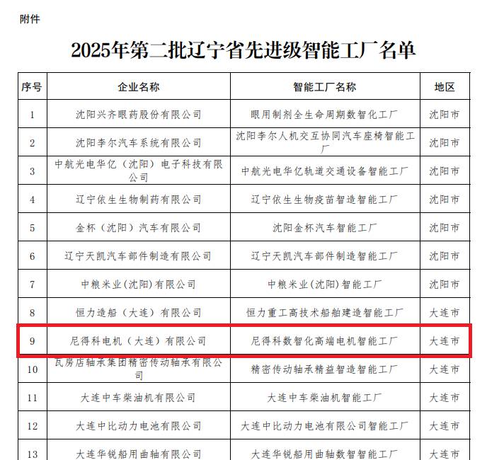 近日,尼得科集团旗下尼得科电机(大连)有限公司(以下简称“尼得科电机(大连)”)成功获评“辽宁省先进级智能工厂”。这一荣誉的取得,标志着尼得科电机(大连)在智能制造领域再上新台阶。此前公司已获评“TISAX最高等级(AL3)体系认证”、“省级绿色工厂”以及市级专项资金支持的“新型技改项目”,这些成果共同彰显了公司在高质量发展道路上的战略布局与扎实成果,标志着公司已跻身智能制造、信息安全、绿色环保和技术创新的行业先锋行列。