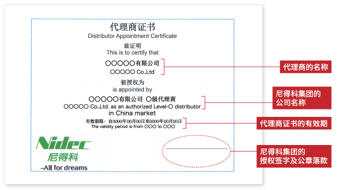 同时,为了抵制非法不良的贸易商伪造尼得科集团的经销商相关资质证明,避免假冒的经销商给您带来不必要的损失。我们正式推出了正规经销商查询功能,从而帮助您辨别该供应商是否是尼得科集团的正规经销商。