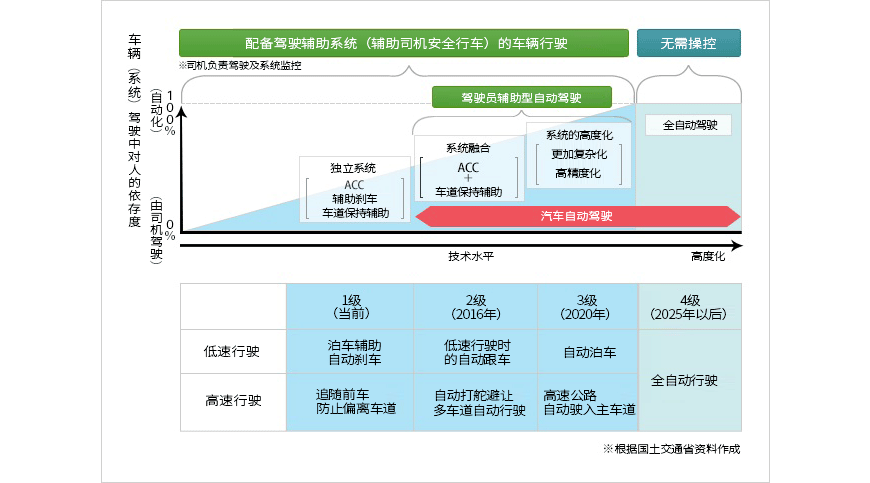 随着人口向城市地区的集中及不断地老龄化,减少交通事故、缓和交通拥堵以及降低环境负荷不仅是汽车产业、也是整个社会旨在实现的目标。作为该目标的一个里程碑,ADAS(高级驾驶辅助系统)应用程序崭露头角,构成ADAS的各种机能也正在普及。而自动驾驶正是ADAS的延长线上的产物。也就是说,在现有的车载系统的驾驶支援中,通过慢慢地减少驾驶者的参与,将驾驶辅助机能多样化地组合到一体,从而实现完全意义上的自动驾驶。