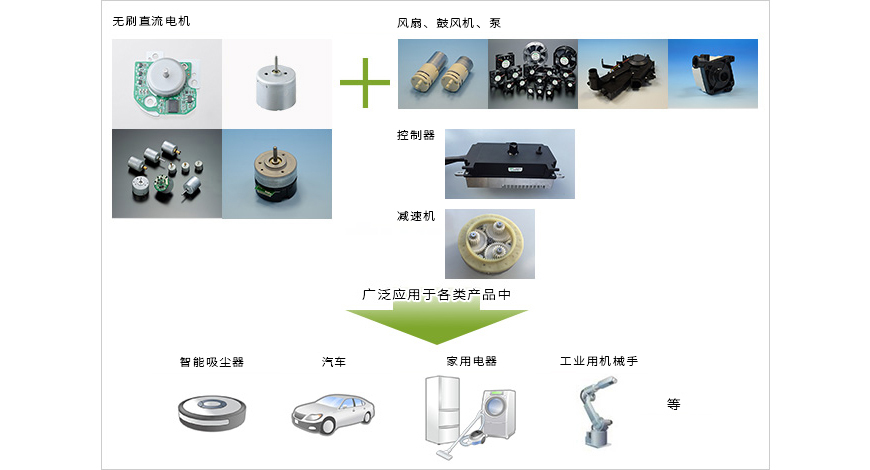 通过在电机的基础上附加风扇、风机、泵、减速机、控制器等,从开发初期阶段开始作为模组产品进行设计,可以实现包括附加电机在内的机构部的模组整体达到较佳状态,并能够实现较高的性能。