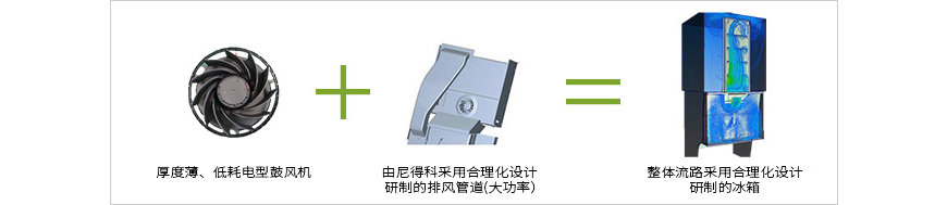 再来看一下冰箱。为使箱内的冷气循环流通,更有效地提高冷藏、冷冻的效果,冰箱中使用的是风扇电机。迄今为止,我们一直在想方设法解决如何降低风扇电机自身耗电量的技术课题。如今,随着客户对风扇电机性能的要求不断提高,我们运用流体解析技术,对冰箱出风口处的气流通道进行改良,加装了专为冰箱研制的超薄风机模组,在进一步降低冰箱耗电量(能效提升)的同时,还为加大箱内的容积做出了贡献。
