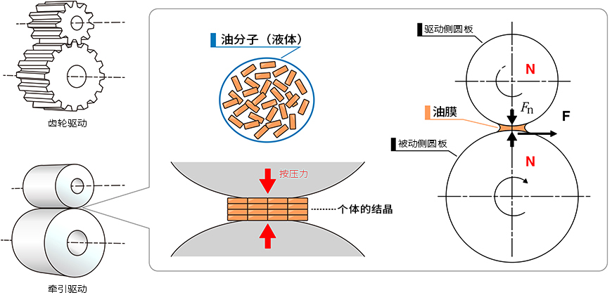 牵引驱动器是一种使用经由润滑油膜相互按压并滚动的辊,将动力从一个辊传递给另一个辊的技术。辊的接触部将产生非常高的压力。液体分子在常压下可自由移动,但在高压下会规则地排列成固体结晶。牵引驱动器利用这一特性将动力从一个辊传递给另一个辊。