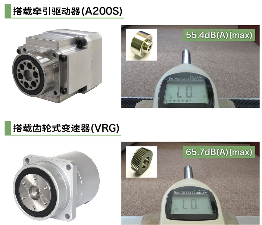 在使用同一壳体中分别装有齿轮减速器和牵引驱动器的无人搬运台车进行的噪音比较实验中,牵引驱动器的噪音较低为13dB。即使在图书馆中行驶,发出的噪音也几乎不会被察觉,因此具有良好的适销性。