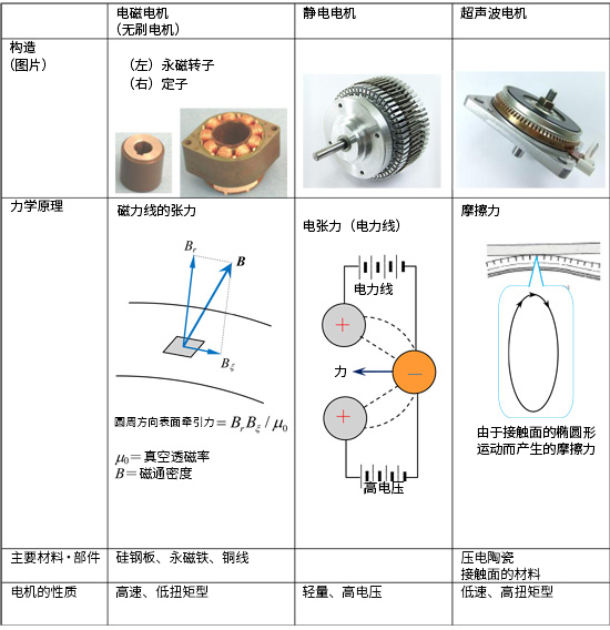 表1中,我们用图表的形式,对三种电机进行了比较归纳。在电磁电机中,我们选取其中代表,即使用永磁铁的无刷电机来介绍。静电电机也有很多种,在这里我们主要介绍一种由指田先生开发,并取得广泛应用的静电电机。