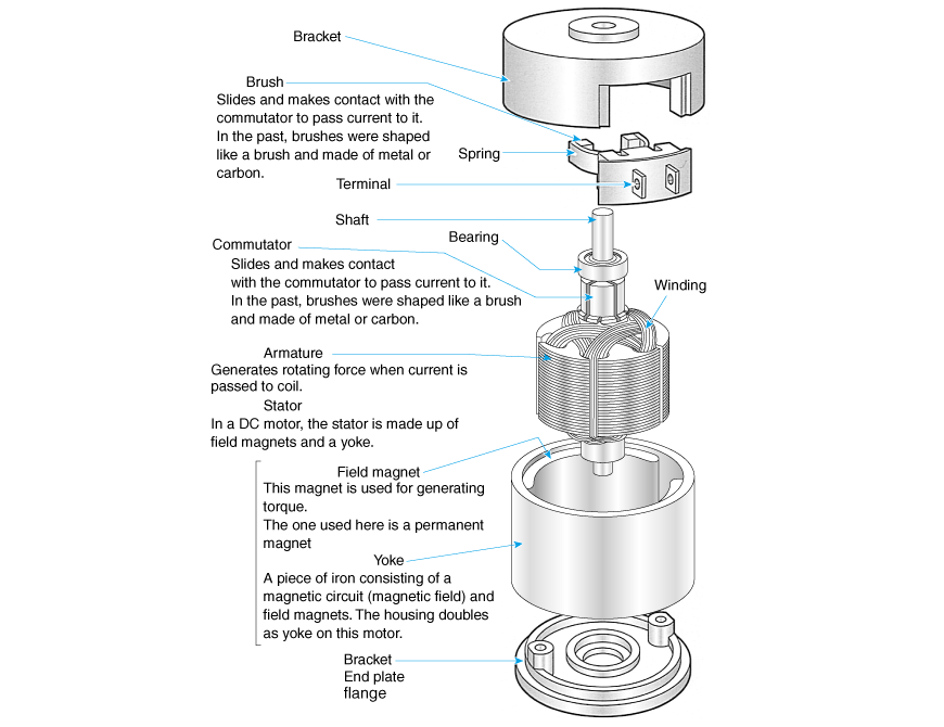 图2.1列出了绘图机及复印机等使用的直流电机的构造和各部位名称。