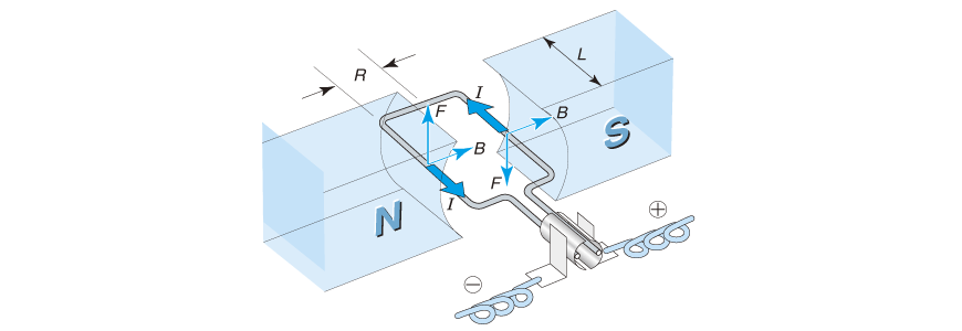 如图2.3 所示,将电线制成线圈,按图示方向通入电流I,则线圈的左侧、右侧会分别产生朝上、朝下的力,线圈开始旋转。这就是在学校中学到的直流电机的旋转原理。