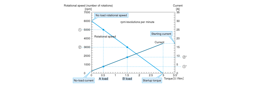 举一个例子,假设电机在负载A的状态下工作。电机的转速为①、电流为①′。这里,假设负载变成B的状态,则转速变成②、电流②′的状态。