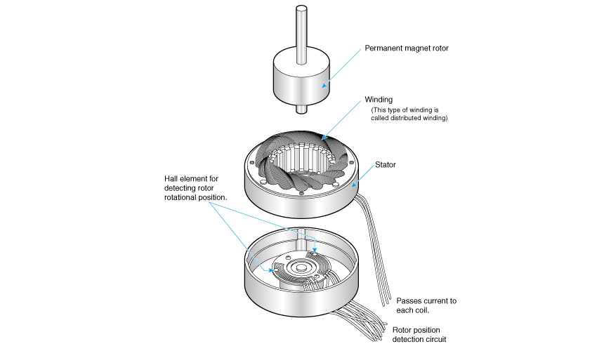 (2)无刷直流电机的结构例子。在右侧机壳内部可以看到位置检测用传感器。
