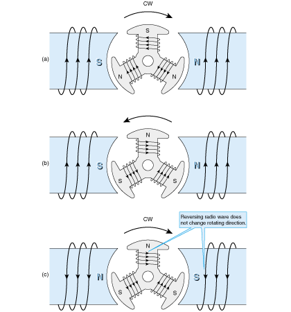 但,串激电机的话,则会像该图(c)所示,磁铁的极性也会反转,因此,旋转方向不会改变。