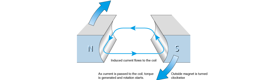 出现电流后,与原来的磁场作用,线圈会产生扭矩,线圈开始旋转。