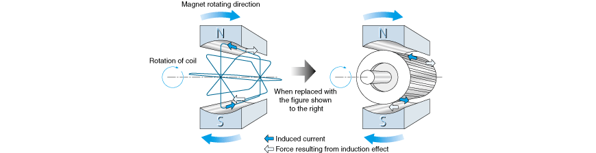 使用了鼠笼式转子的电机的旋转原理利用阿拉戈圆盘进行说明并不合适,可以使用与直流电机相同的方法进行说明。