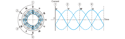 实际的电机中,不是转动磁铁,而是依次励磁多个线圈,可以获得与转动磁铁相同的效果。改变励磁的话,从时间上需要相位偏移2个以上的正弦波。