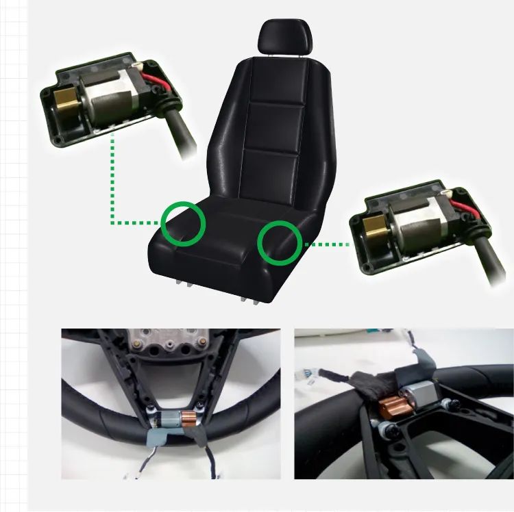 尼得科DC振动马达通常用于汽车座椅或方向盘,通过φ20直流电机与配重、支架结合,通过高频率振动进行感觉反馈。当收到汽车航线偏离预警或遇到车辆和其他障碍物时,可振动提醒驾驶员采取制动措施。