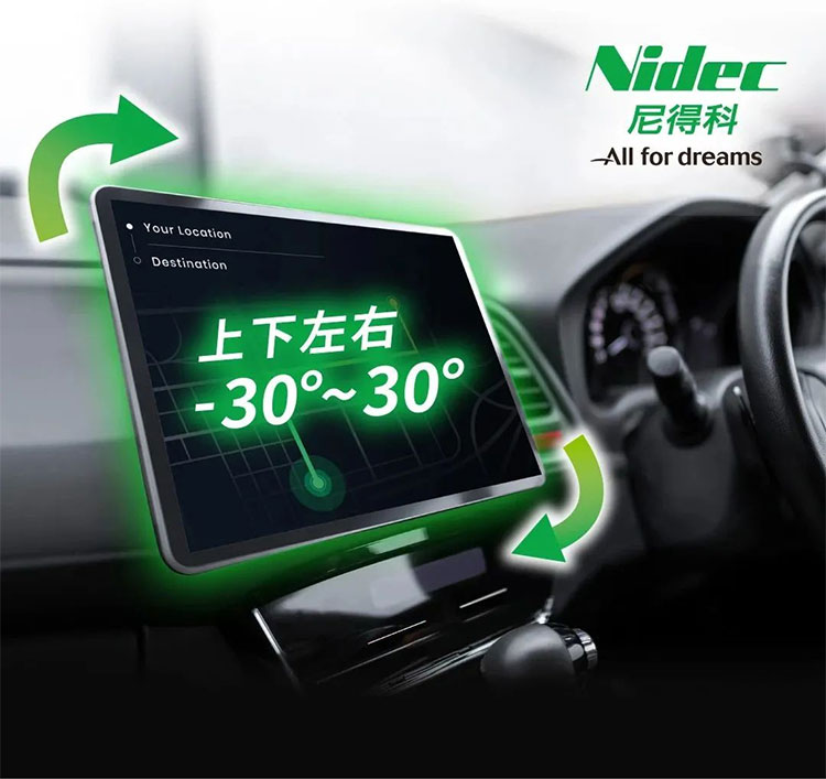 尼得科精密部件(旧:日本电产科宝)* 提供中控屏两轴旋转模组产品,为车载智能旋转触摸屏提供解决方案,用更轻量、更静音的电机助力车载旋转屏,实现轻松交互。