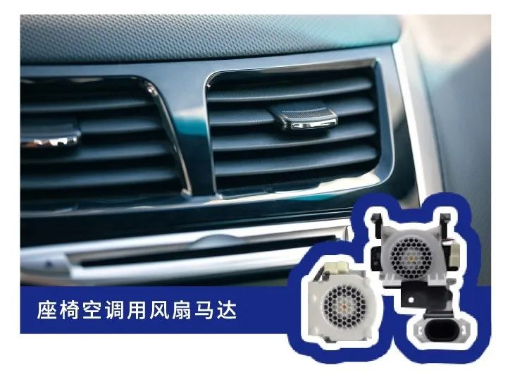 用于冷却座椅。座椅空调风扇与空调的组合使用,提高了燃油经济性的同时,还提升了驾驶员的驾驶舒适度。力求大风量、低噪音,以突出本公司产品的优势。