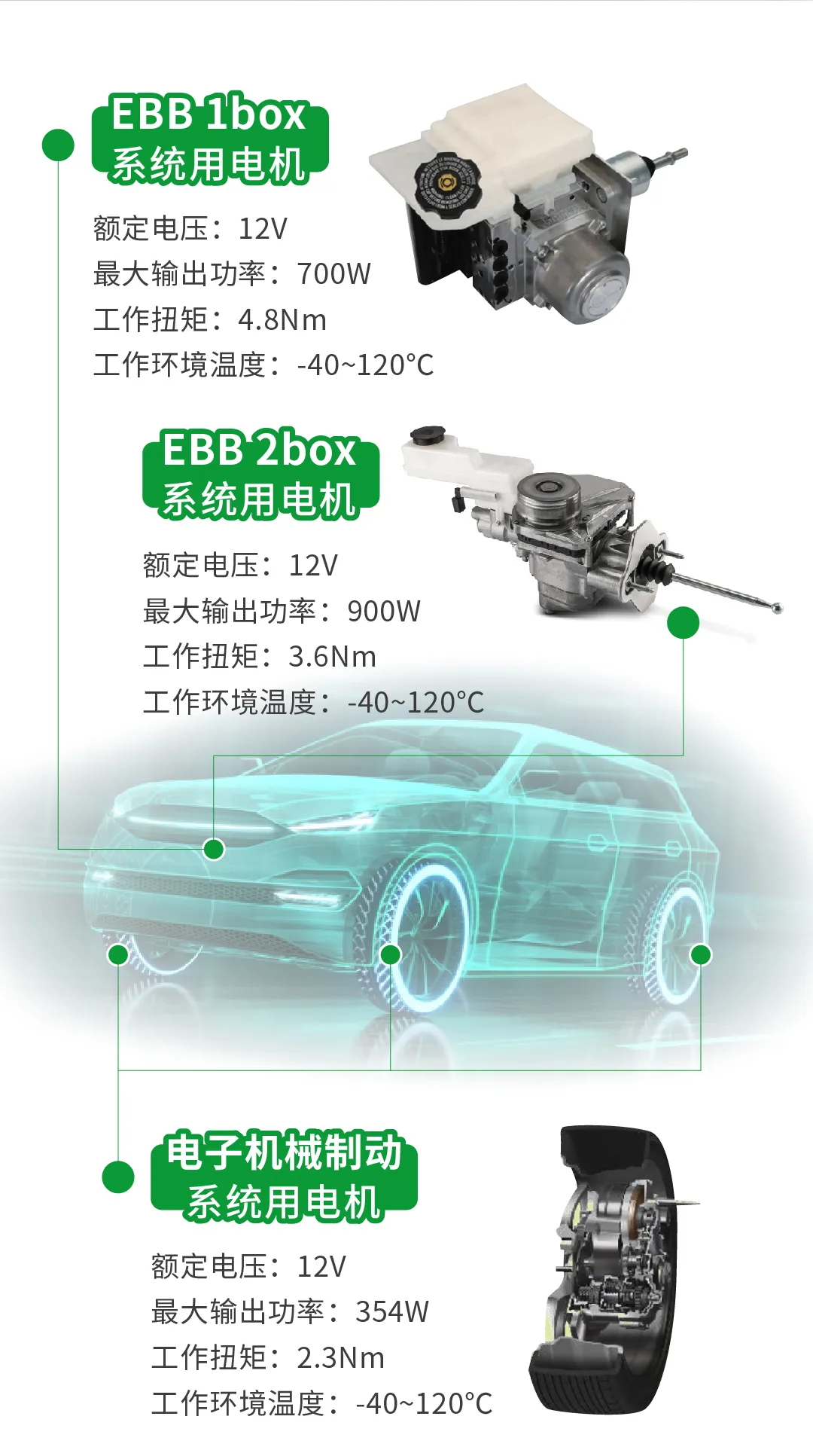 EBB电子助力刹车系统拥有1 box和2 box两种不同型号,搭载在汽车底盘,用于增强制动助力,在电动或混动车制动时参与进行能量回收,通过系统控制能够实现主动制动,提升行车安全性,也可以满足智能驾驶制动相关要求。