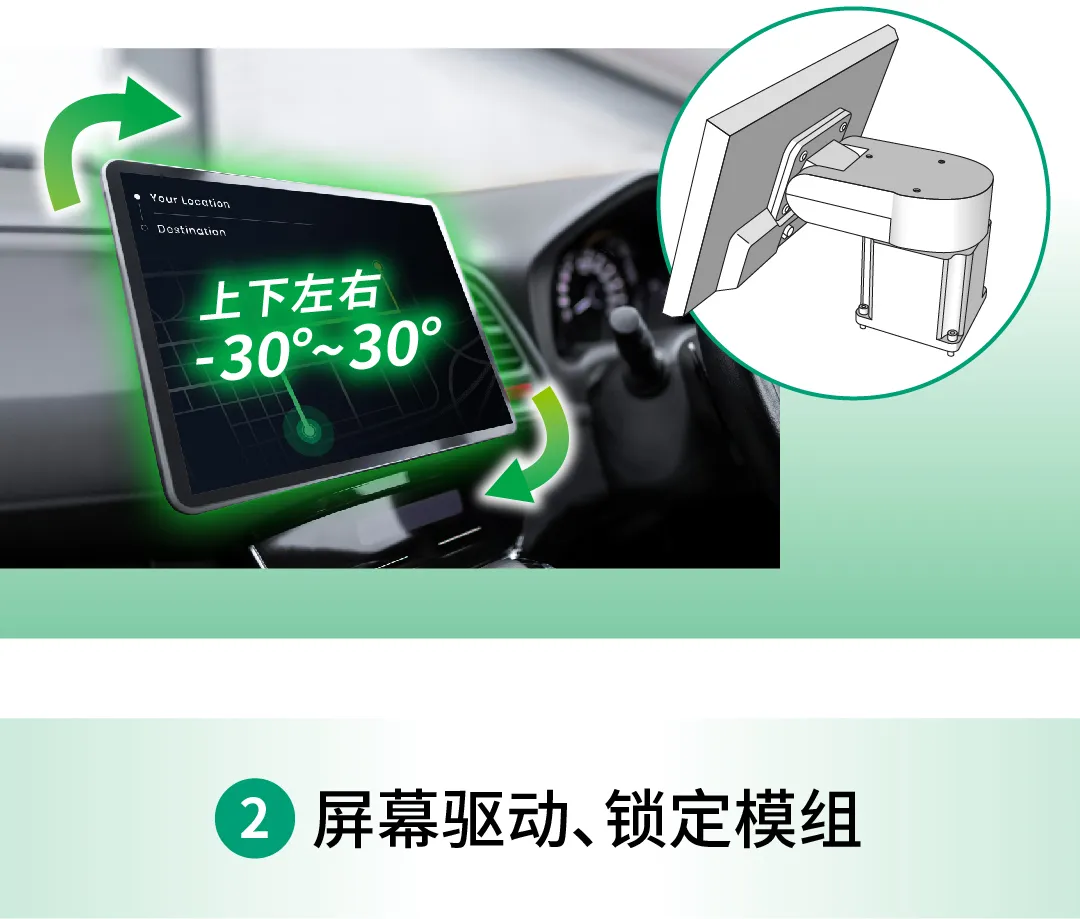 车载多轴向屏幕旋转系统,专为汽车中控显示屏设计。该系统支持俯仰、水平、垂直及伸缩等多方向调节,能够根据不同的驾驶模式和娱乐需求灵活调整屏幕位置。