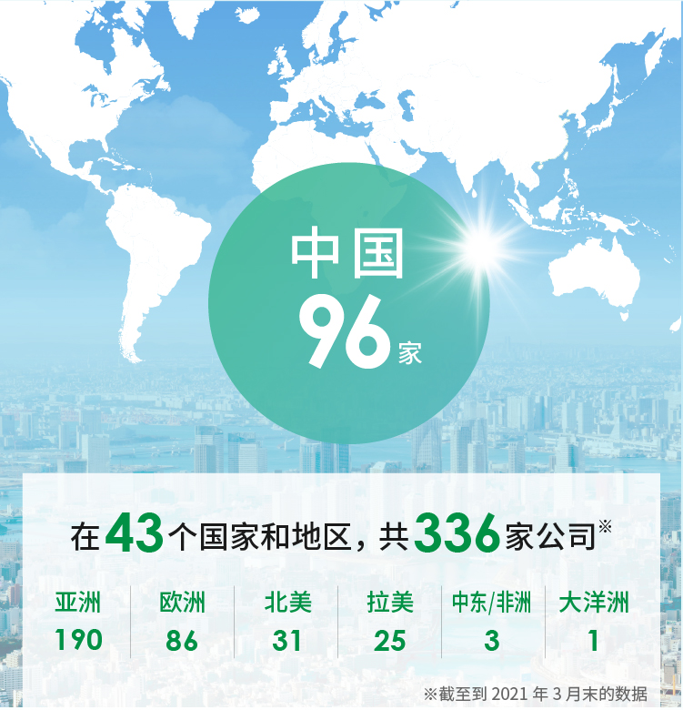 截至2021年3月,我们在全球43个国家和地区共拥有336家相关公司。我们将与全球10万名员工携手共同迈向全球综合机电产品制造商的发展之路。其中,尼得科集团在中国设立了96家公司网点。