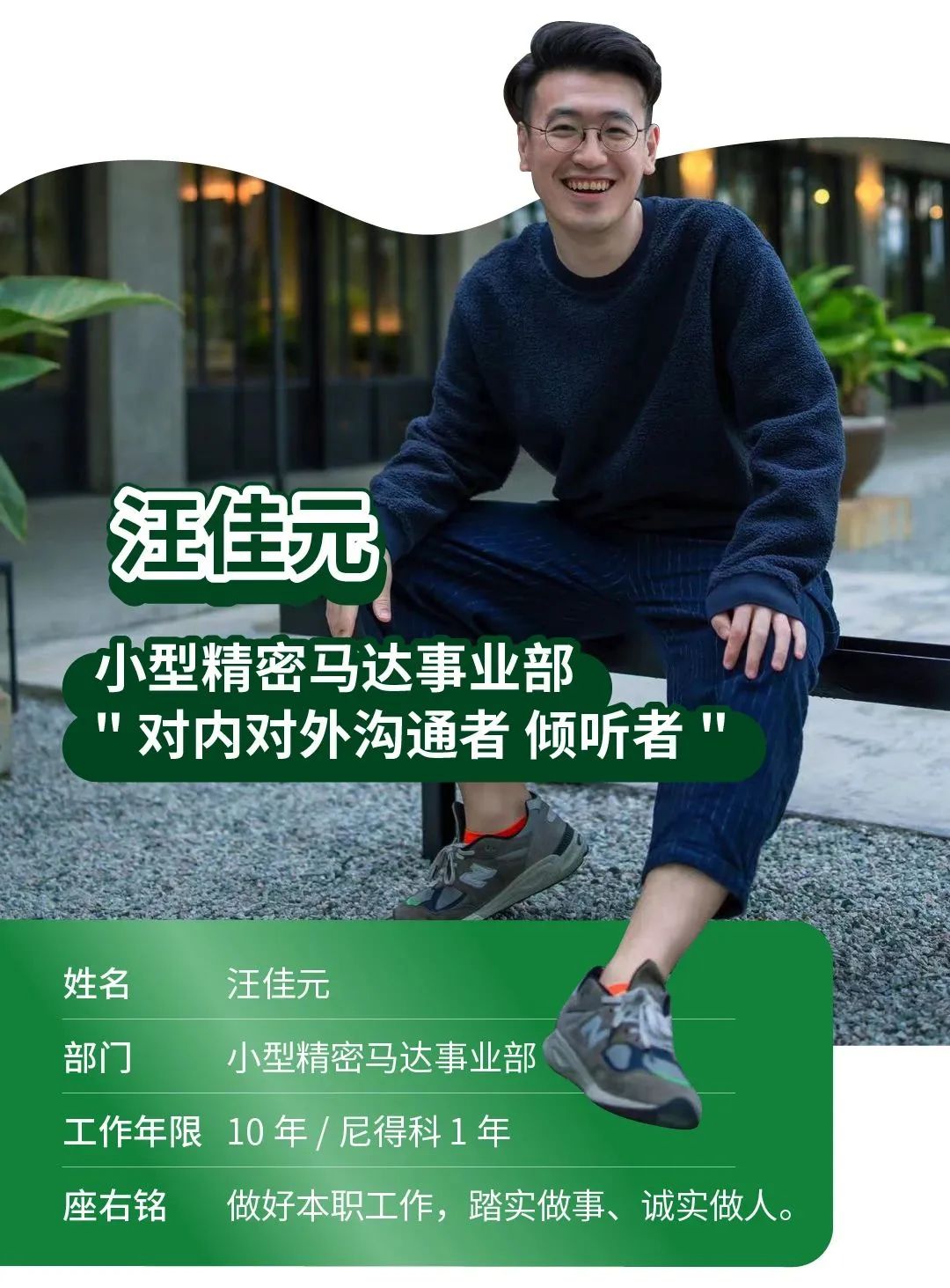 汪佳元,小型精密马达事业部门的新星,在尼得科工作已经一年。生活上,他喜欢登山和足球。工作上,他所在的Team是扫地机器人内置的核心部件——电机&风机组件的供应小组。通过拜访客户,了解客户对于产品的需求&希望改进点,拉通研发一同积极参与,回应客户关切和期望。