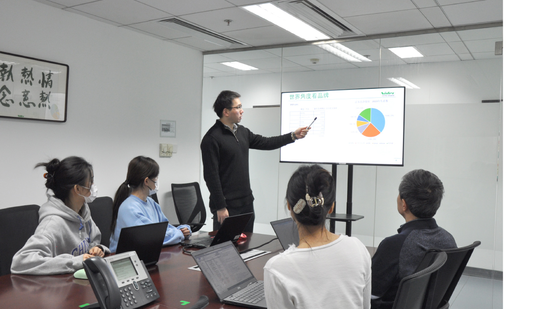 早上9点,销售团队在会议室内汇总并核对了上个季度的销售业绩。王主任带领团队分析各类产品的销售情况,并提出针对性地改进策略。