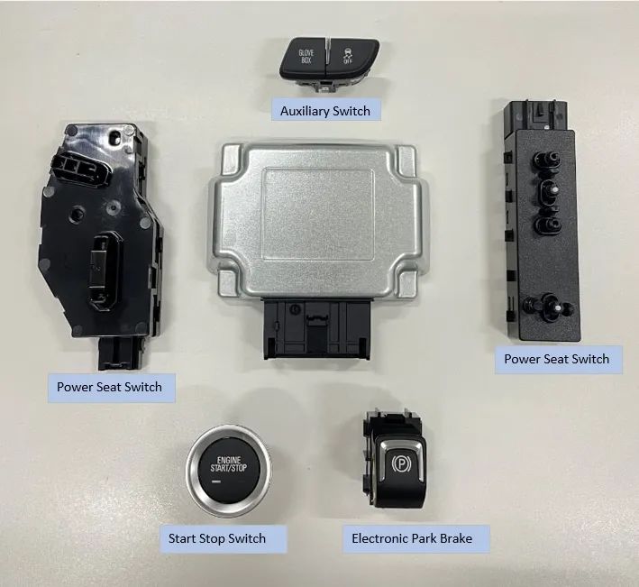 电子驻车开关(Electric parking switch)、启停开关(Start stop switch)、电动座椅开关(Power seat switch)以及电子控制器(DC/DC转换器 )等