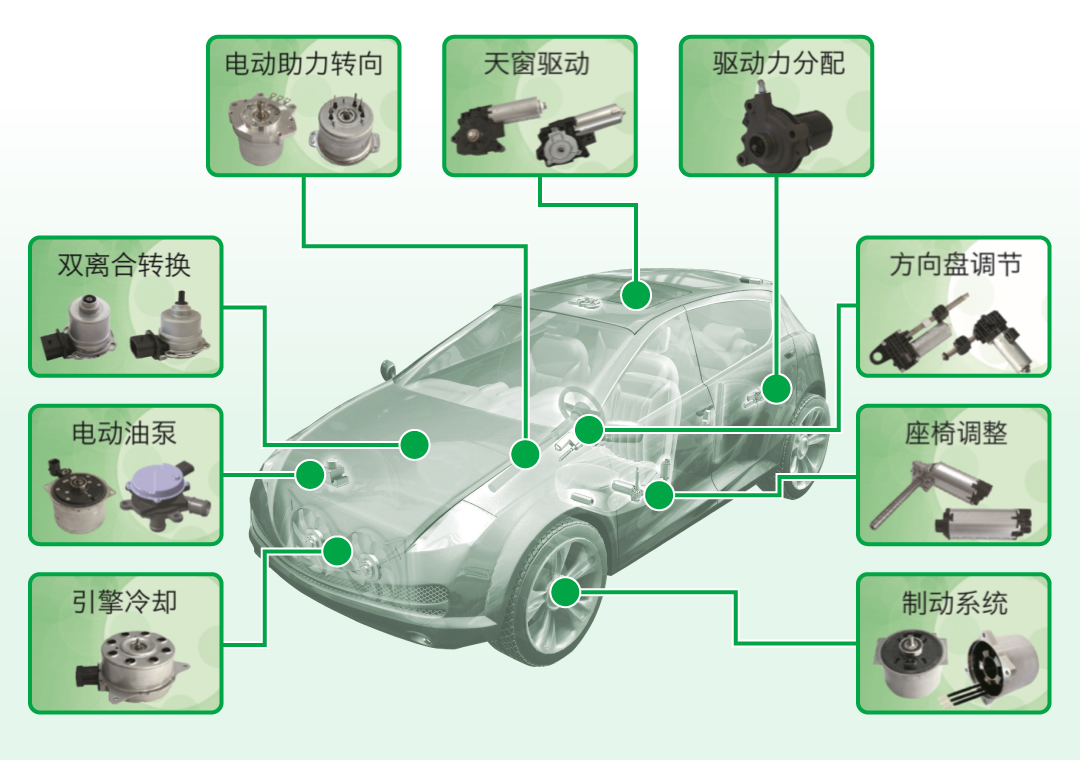 车载用途的各类电机产品,包括传动系电机(双离合变速箱用一体化动力包、差速器用电机、双离合变速箱用电机、引擎冷却风扇电机、两驱及四驱转换用电机)、转向系电机(电动助力转向电机)、制动系电机(电子机械制动刹车电机、电子制动刹车电机、电子稳定控制系统)、舒适系电机(方向盘调节用电机、空气悬挂用电机、天窗电机、座椅调节用电机)及泵类电机(电动水泵、电动油泵、电子真空泵电机)。