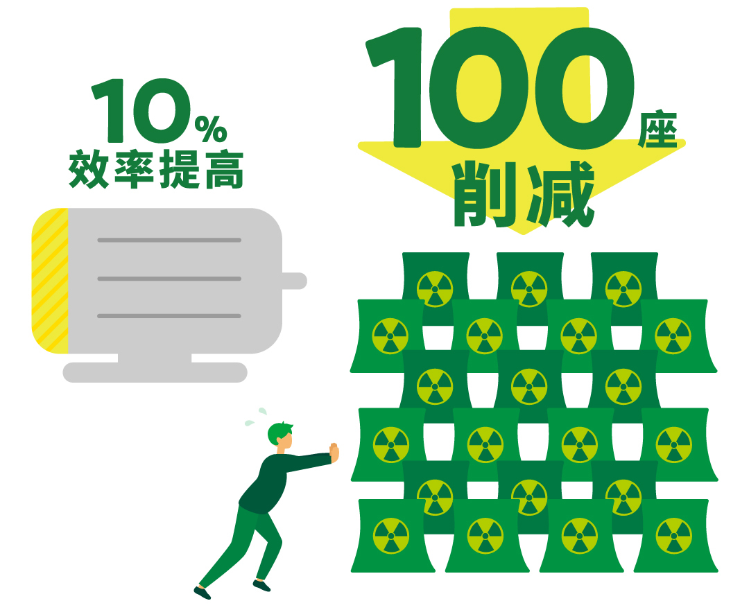 提高电机的能效可以降低耗电量。假设地球上所有电机的能效都提高10%,就能削减100座核电站!电机能效的提升不仅依赖于设备本身,还需要配套设备(如逆变器、齿轮、轴承)的整体优化。(※2)尼得科不仅聚焦于电机本体,还通过开发集成化解决方案(如用于电动汽车的电驱系统、包括压缩机与风扇的冷藏设备单元)实现整体节能目标,全面推动碳中和进程。
