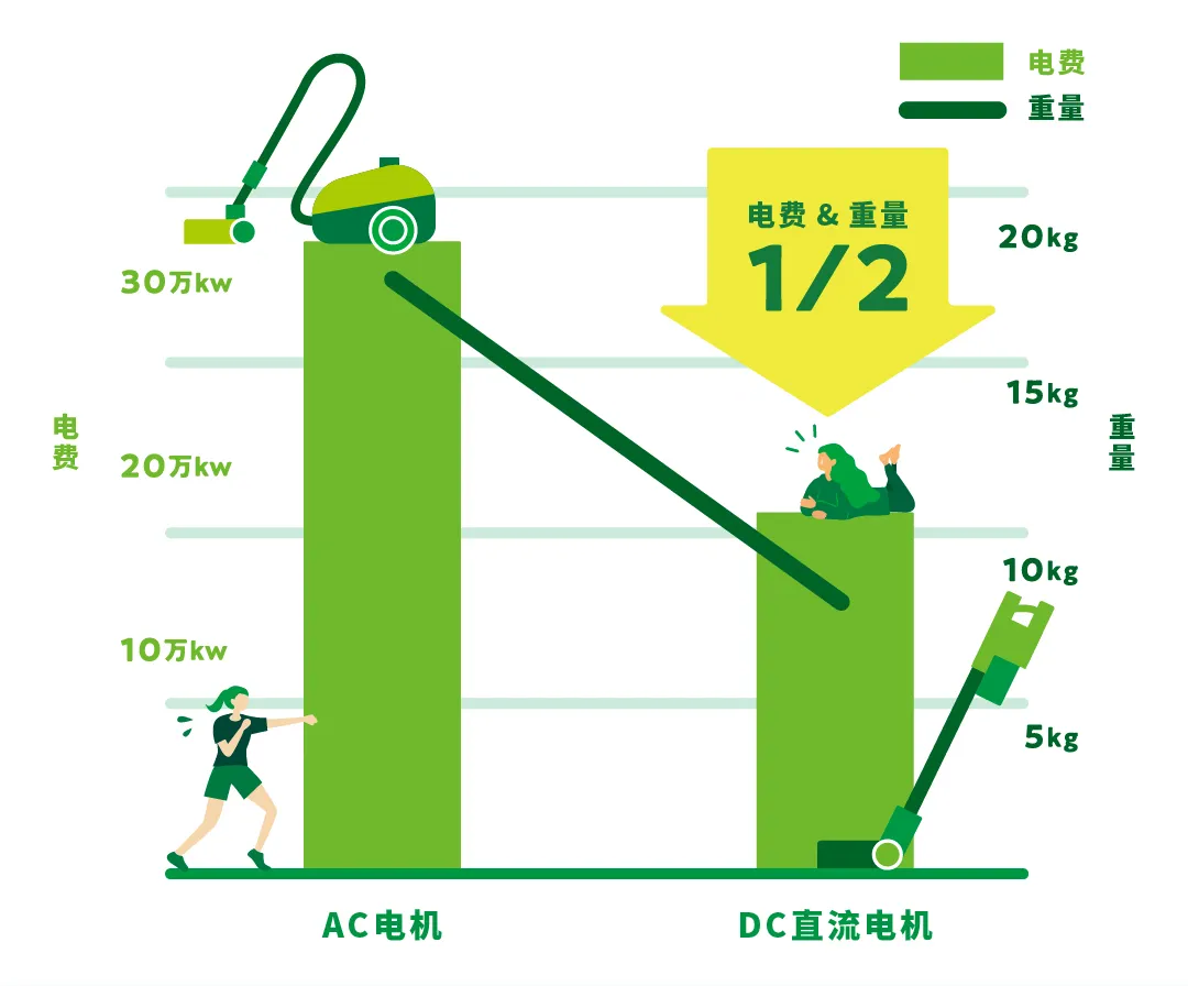 传统的吸尘器是有电源线的,而如今的吸尘器却没有电源线,这一变化与电机的进化息息相关。通过将传统的AC电机升级为更加小型、高功率且低能耗的DC无刷电机,使吸尘器实现了电池驱动。与传统的筒式吸尘器相比,无线吸尘器吸力提升了2倍,重量减少了约40%。