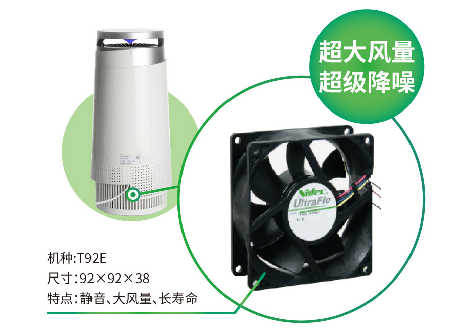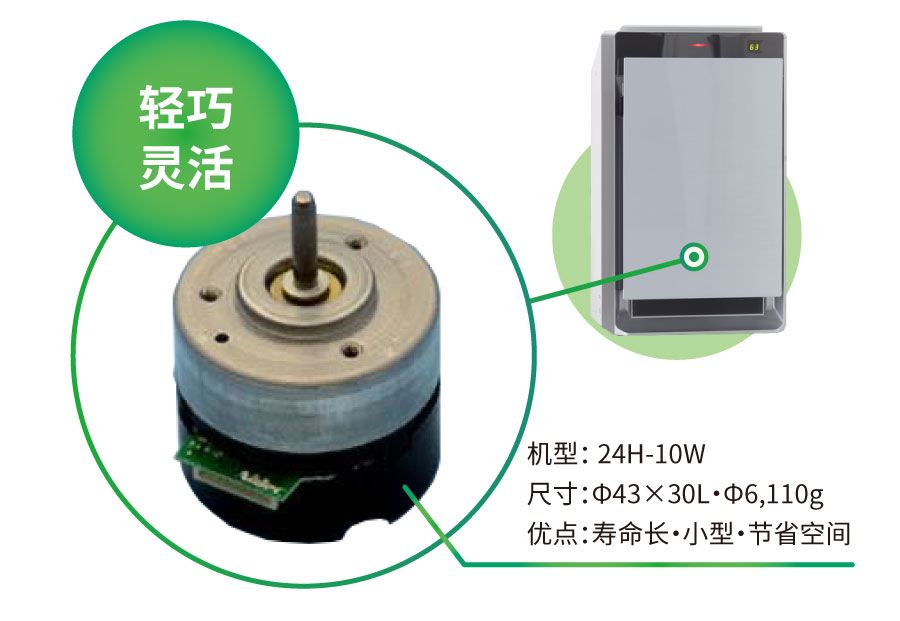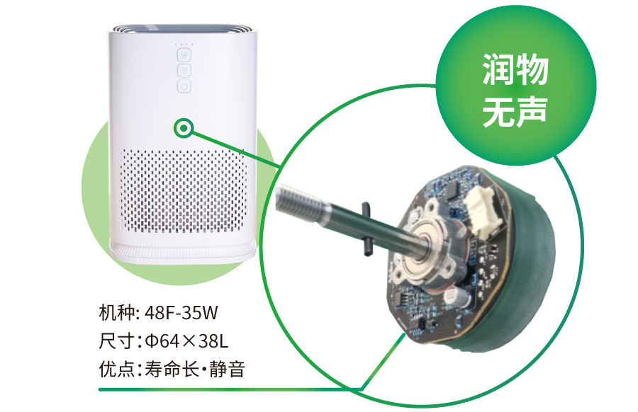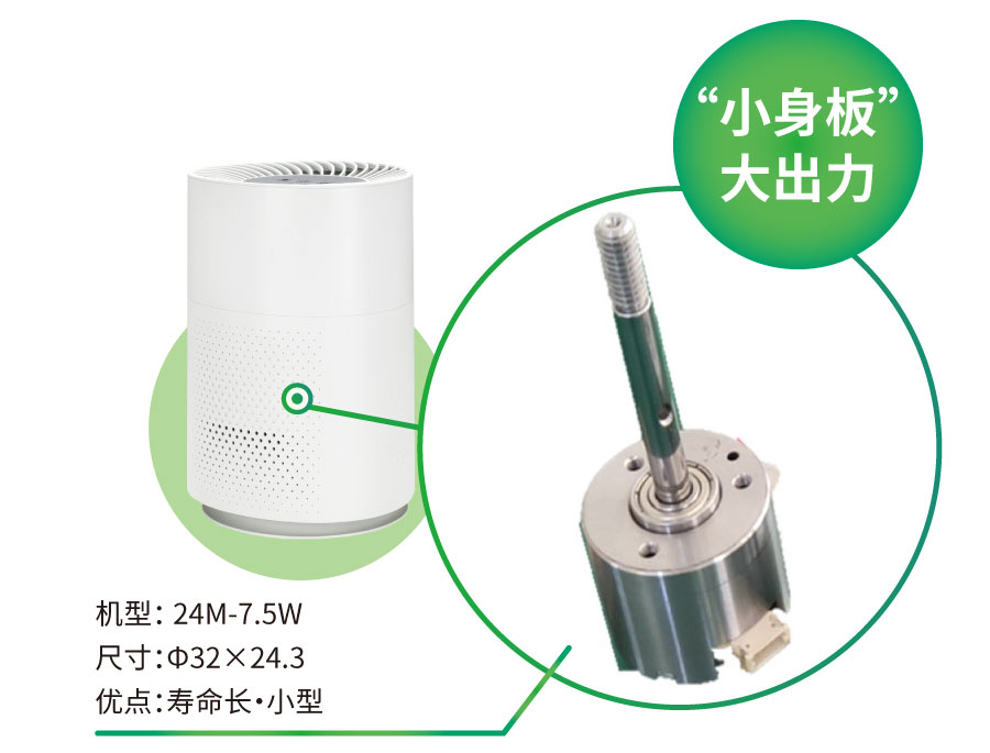 尼得科24M-7.5W电机产品,在空气净化器领域也展现了卓越品质,凭借自身“小身板”、大出力,做到了真静音、超耐用!