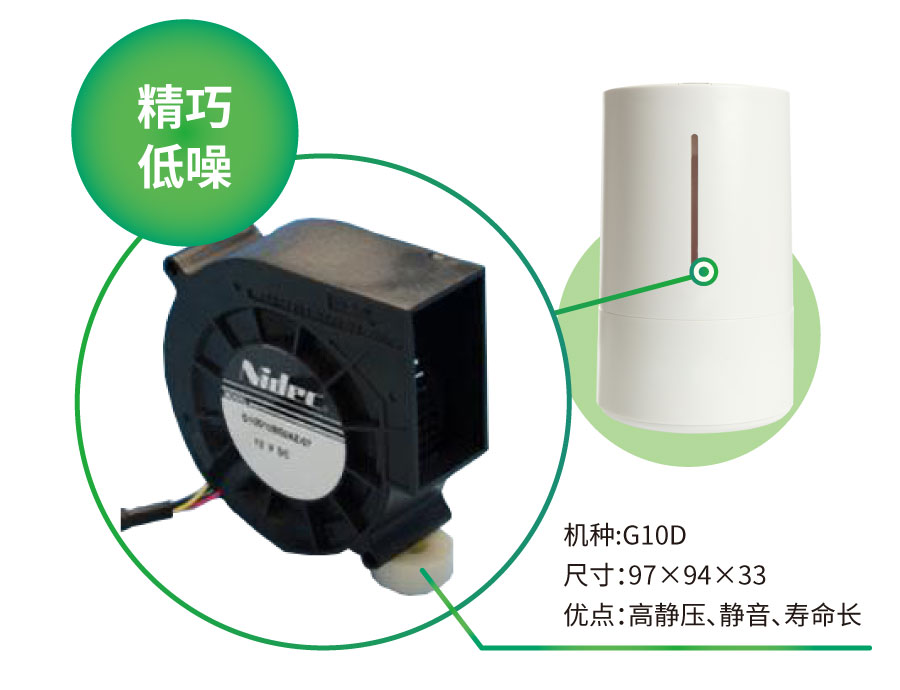 在车载净化器、加湿器领域,尼得科也大有作为,G10D型电机以97×94×33mm的精巧尺寸,与高静压低噪音的优势在车载行业占有率颇高,助力千万车主一路惬意畅行。