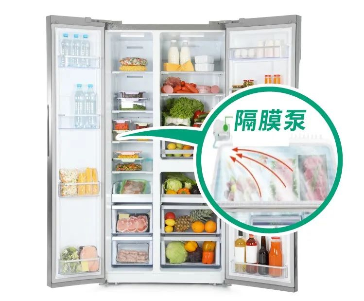 一种是回转式隔膜泵,抽取空气,真空保鲜。一种是直动式隔膜泵,实现氮氧分离,控氧保鲜。