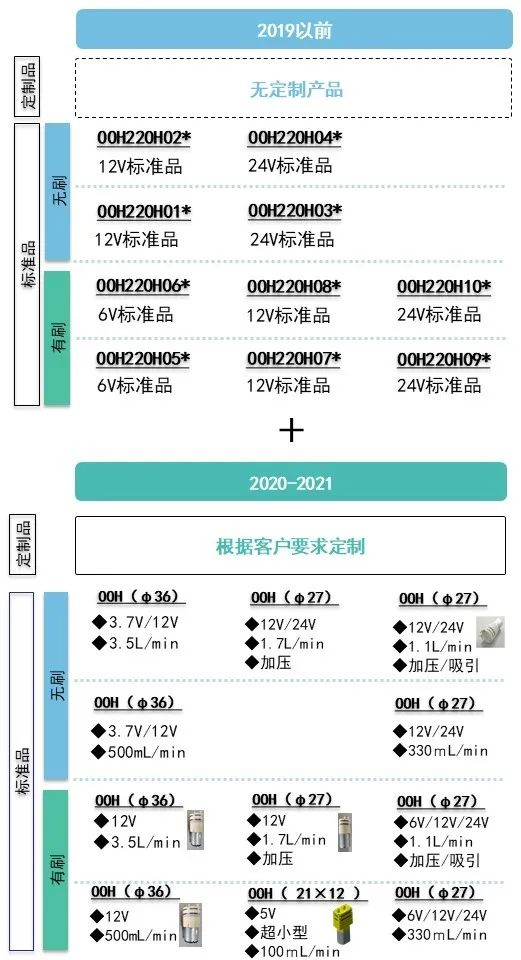 如上图的研发产品列表,近两年来随着研发实力的增强,相继开发出从超小型到大型、适配不同电压的多种送气、送水用真空泵,还可根据客户的实际需求灵活调节。
