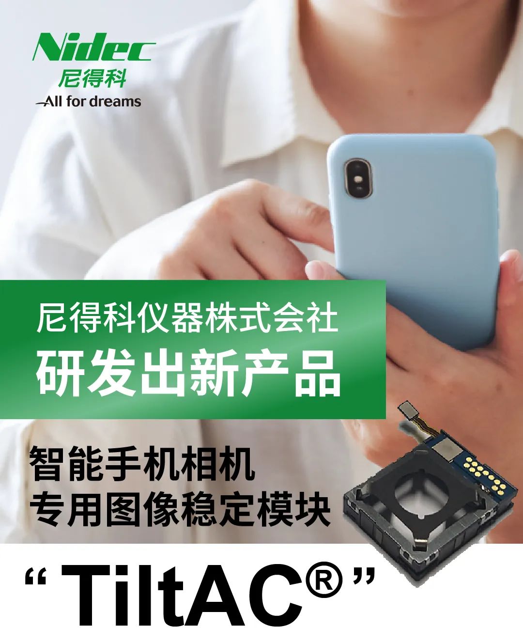 尼得科集团旗下的尼得科仪器株式会社(旧日本电产三协)研发出了智能手机相机专用的新款图像稳定模块“TiltAC®”产品。